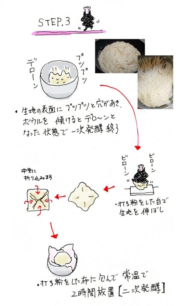- 強力粉で打ち粉をした台に生地をのせ、手で引っ張りながら四角形に伸ばす。(手に生地がくっつくので、手にも水か打ち粉をしておくと良い。)四角形に伸ばした生地のコーナーを折り紙の要領で中央に折り込む。折った側を下にして打ち粉をした布の上に生地を乗せて包む。パンの形を丸くするため、布ごとボールに入れ、そのまま2時間常温で放置して二次発酵させる。