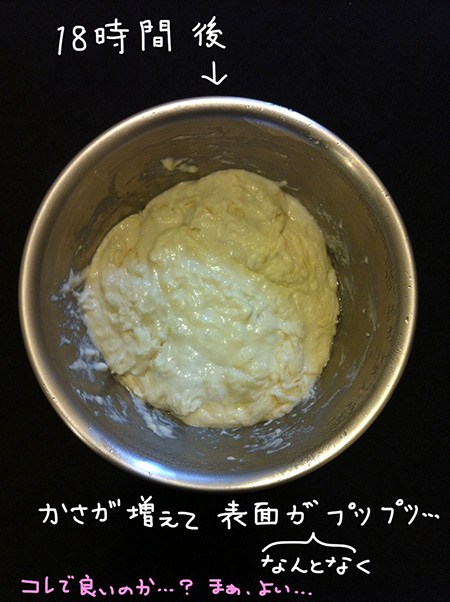 - 12時間〜18時間後、一次発酵の様子をチェックする。プツプツと穴が空いて、ボウルを傾けるとデローンとなる感じで発酵成功。この時点でかなりユルい生地。