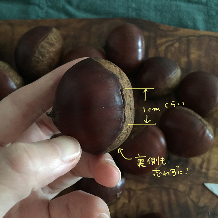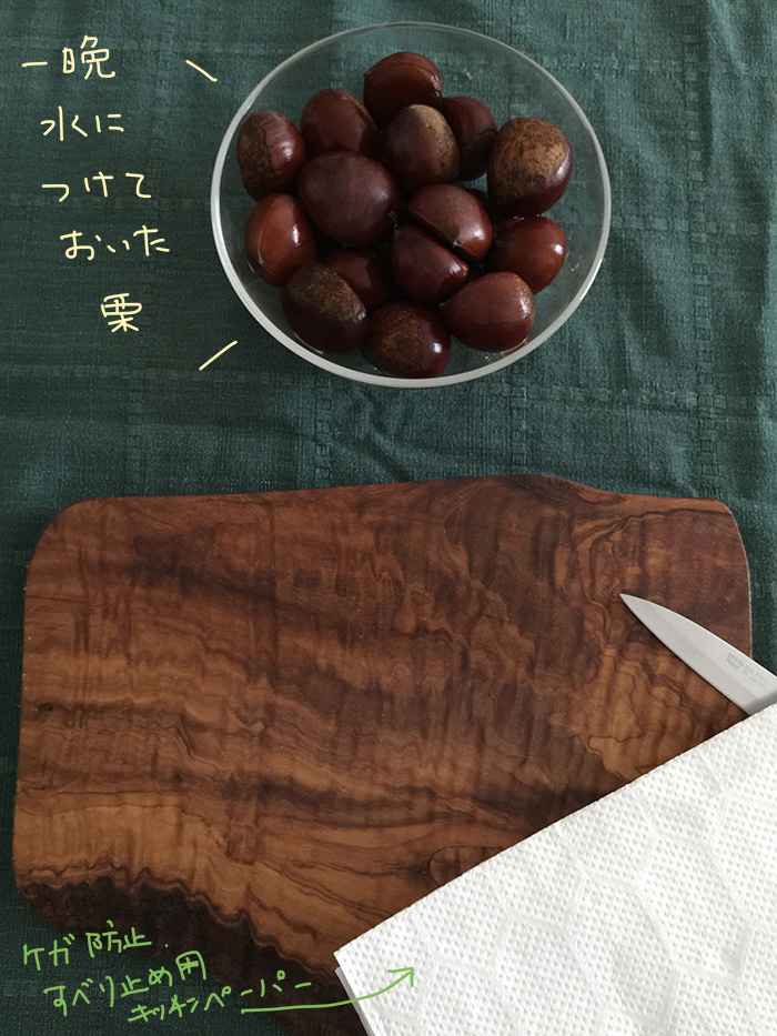 嬉しがっていっぺんに並べちゃいましたが1個づつ取り出して切り込みを入れていきましょう。すべりやすいのでキッチンペーパーなどで栗が動かないよう固定するなど工夫してみてください。