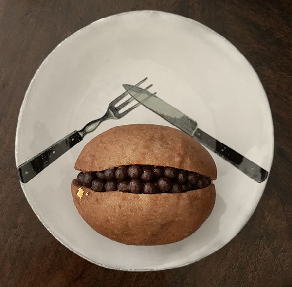 丁寧に焼かれたブリオッシュショコラのパン生地に、甘さ控えめだけどコクのあるオーガニックチョコガナッシュ、さらにそのうえにVALRHONA社特製のシリアル入りチョコレートがたっぷりとはさんであります。