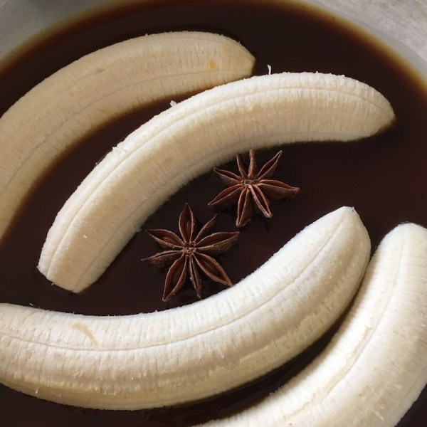 - 5にバナナの断面を下にして入れ、スターアニス、シナモンを入れ、バナナにカラメルをかけながら火を通す。