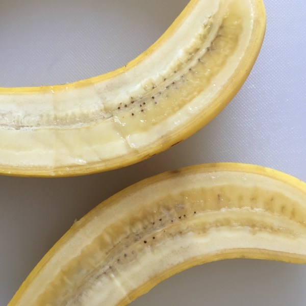 - バナナは皮付きのまま縦半分に割り、皮を剥く。