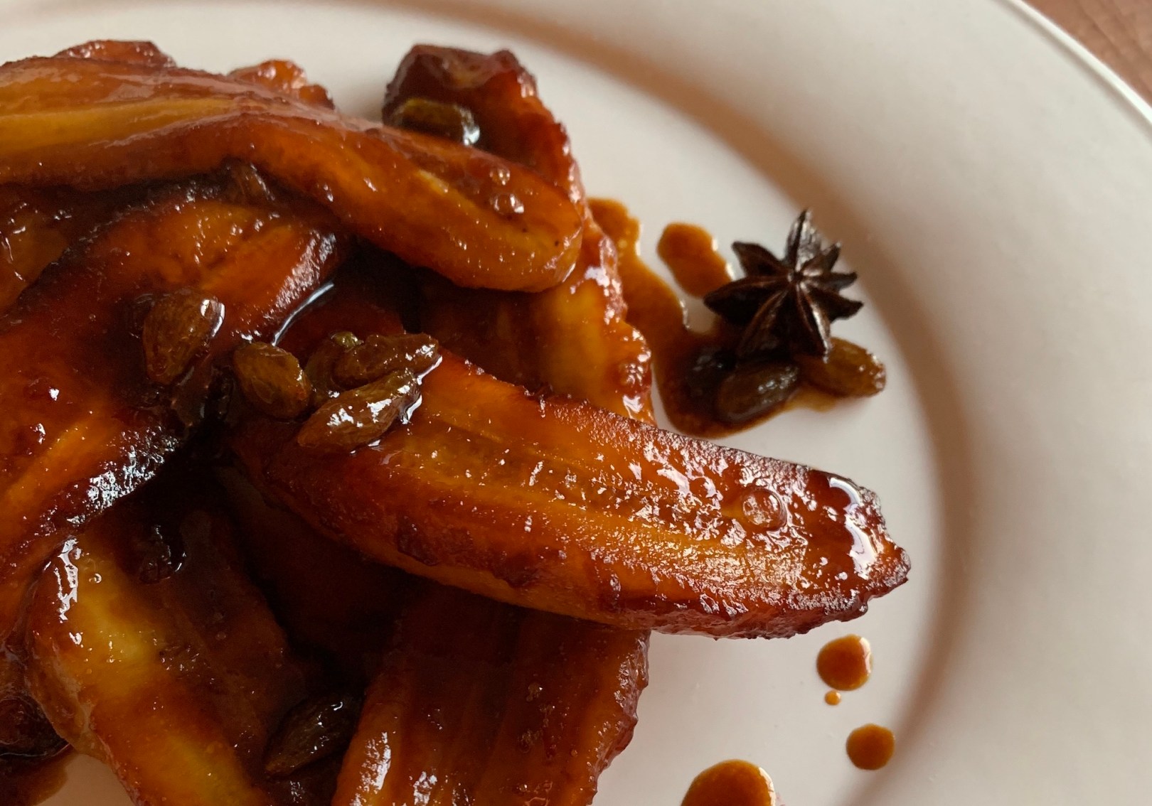 どうやらカラメルをオレンジジジュースで伸ばし、そこにバナナを入れて火を通し、アニス、シナモン、バニラで香りをつけてレーズンを入れて仕上げるらしい。