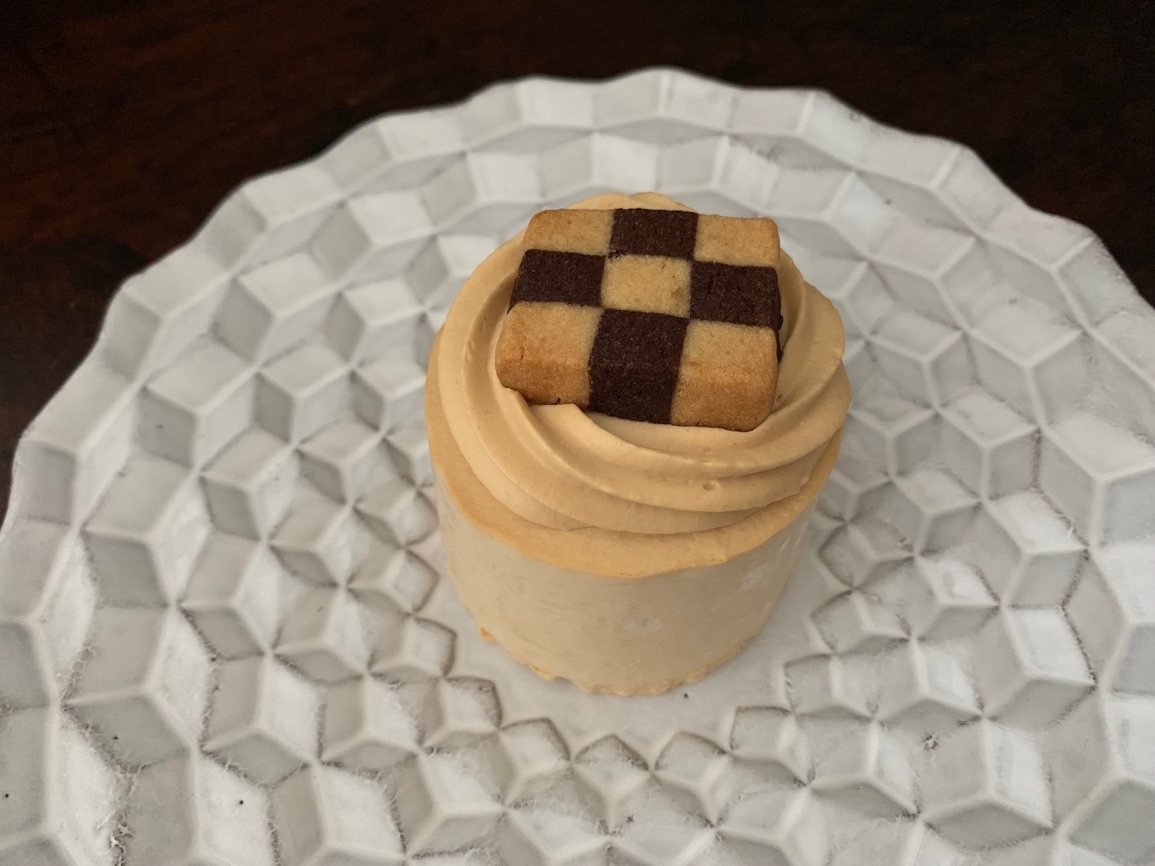 キャラメル色をした円柱の上にこんもりとクリームがもられ、その上にチェス盤模様のモザイククッキーが乗っています。