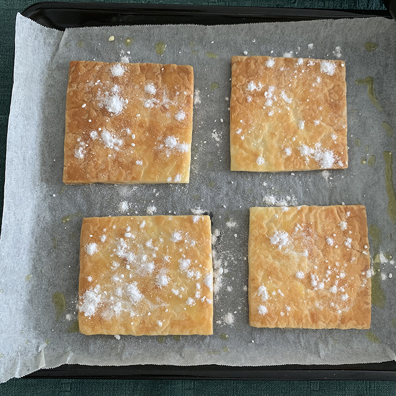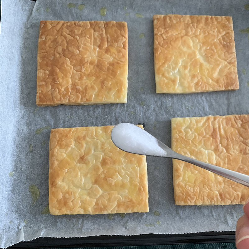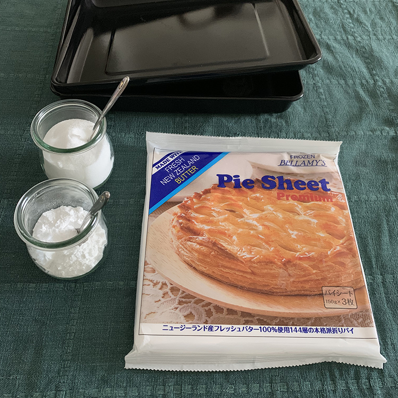 - オーブンを温めている間に取り出したパイ皮にグラニュー糖をふりかけ、その上からさらに粉砂糖をふりかける。