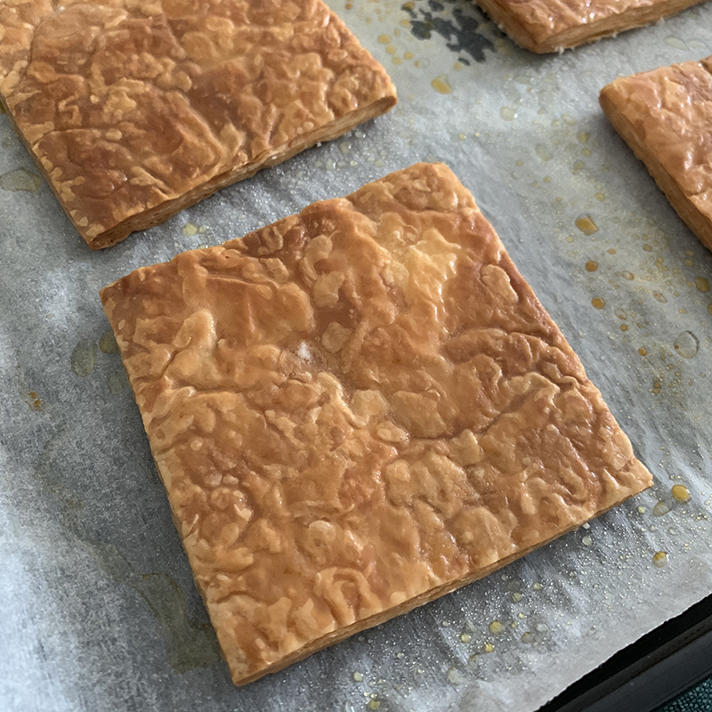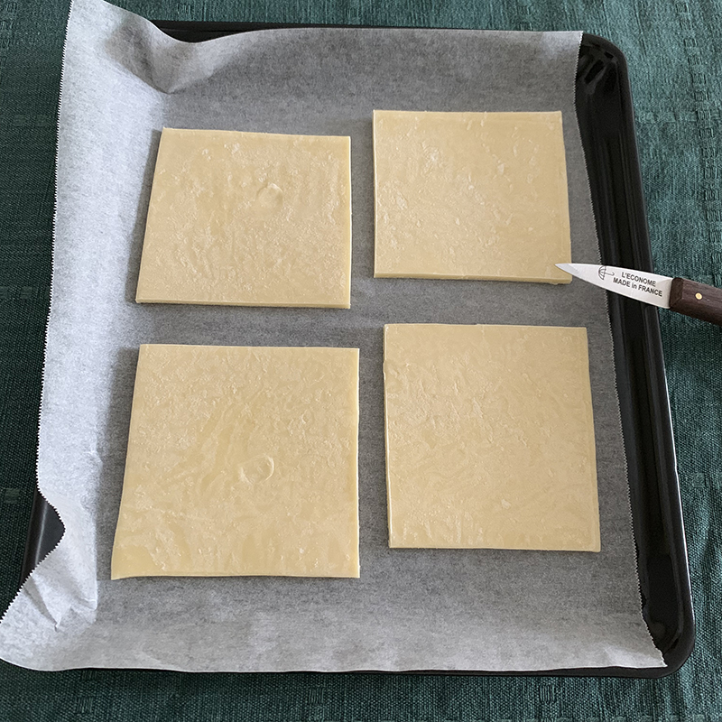 冷凍パイシートはいつもフレッシュバターと小麦粉と塩だけで作られているものを使っています。わたしのお気に入りはニュージーランド製「ベラミーズ」です。本格的な折りパイ生地なので、他のお菓子にもアレンジができてとても便利です。