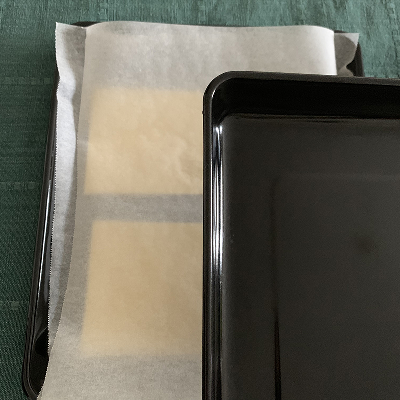 - パイ生地の上にクッキングシートをかぶせ、その上から天板を重ねて重石にし、予熱したオーブンに入れて10分焼く。