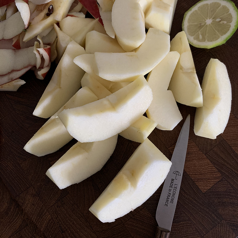 - 次にリンゴのカラメリゼを作る。リンゴの皮を剥き、適当な大きさなカットする。