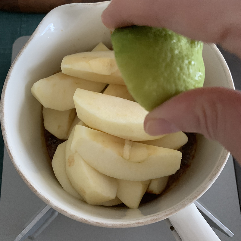- そこにカットしたリンゴを入れ、中火にかけ、レモン汁を入れる場合はここで加える。