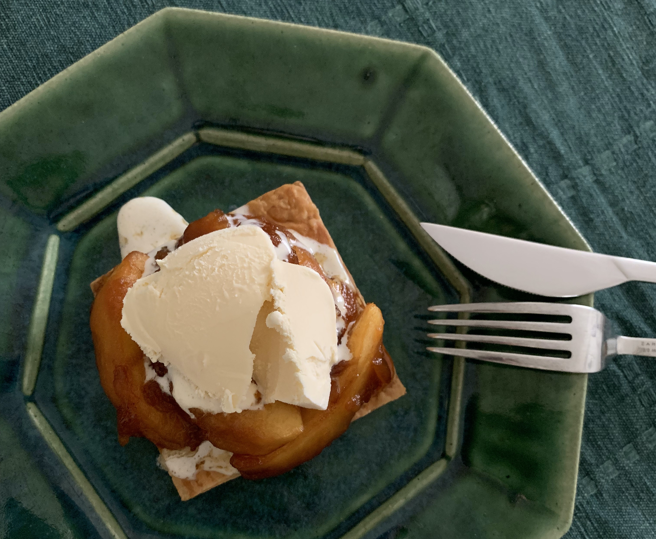 - 焼き上がったパイ皮の上に煮たリンゴのカラメリゼを乗っけ、好みでバニラアイスクリームを乗せて食べる。