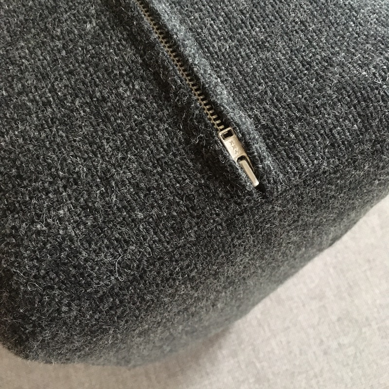 長方形の布が底中央で合わさる部分にジッパーをつけ、そこからクッションの中身を出し入れする。
