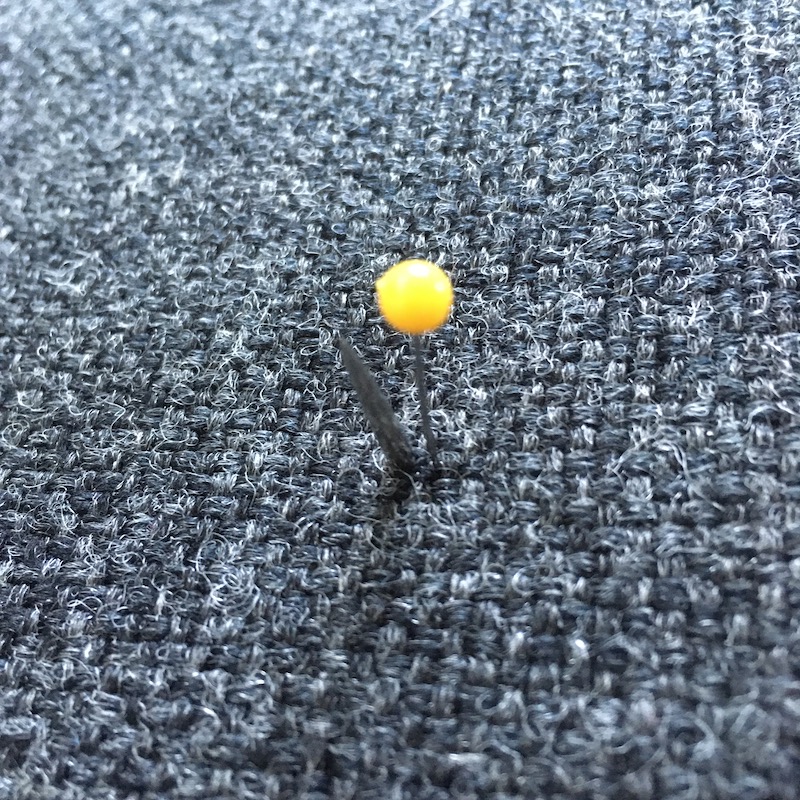 まずはボタンをつけたい場所にマチ針で印をつける。ボタンはクッションの両側につけるので、目印も両側につける。