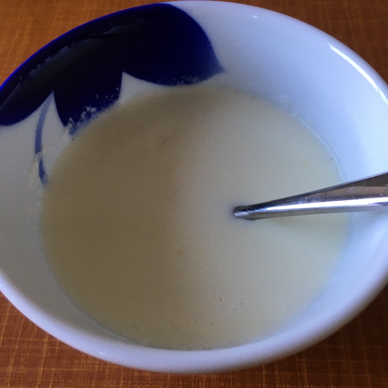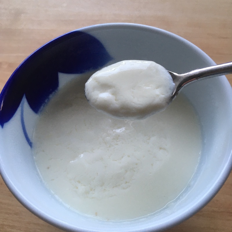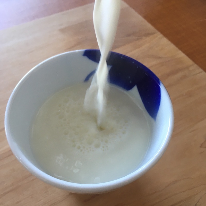 - 1のカップに2の温かい牛乳を勢いよく注ぎ入れ、皿などで蓋をして5〜10分放置する。固まったら出来上がり。