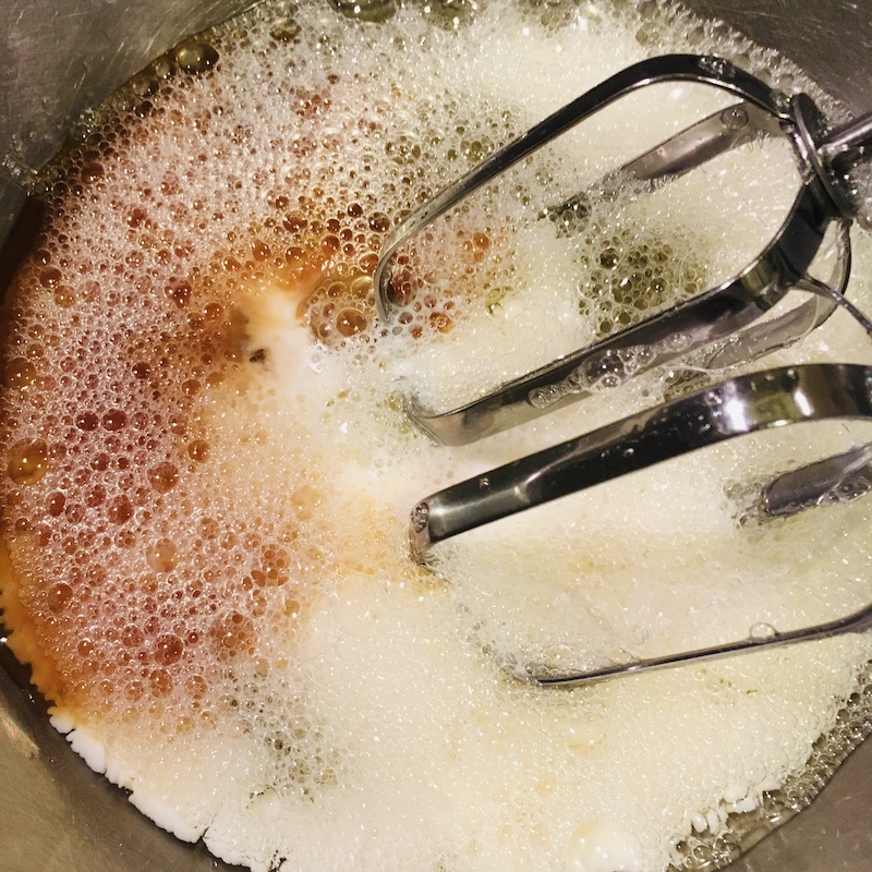 バターが十分に柔らかくないと綺麗に混ざらないので、バターだけ別途ハンドミキサーにかけて泡立て、柔らかくしておくと混ぜやすいかもしれない。