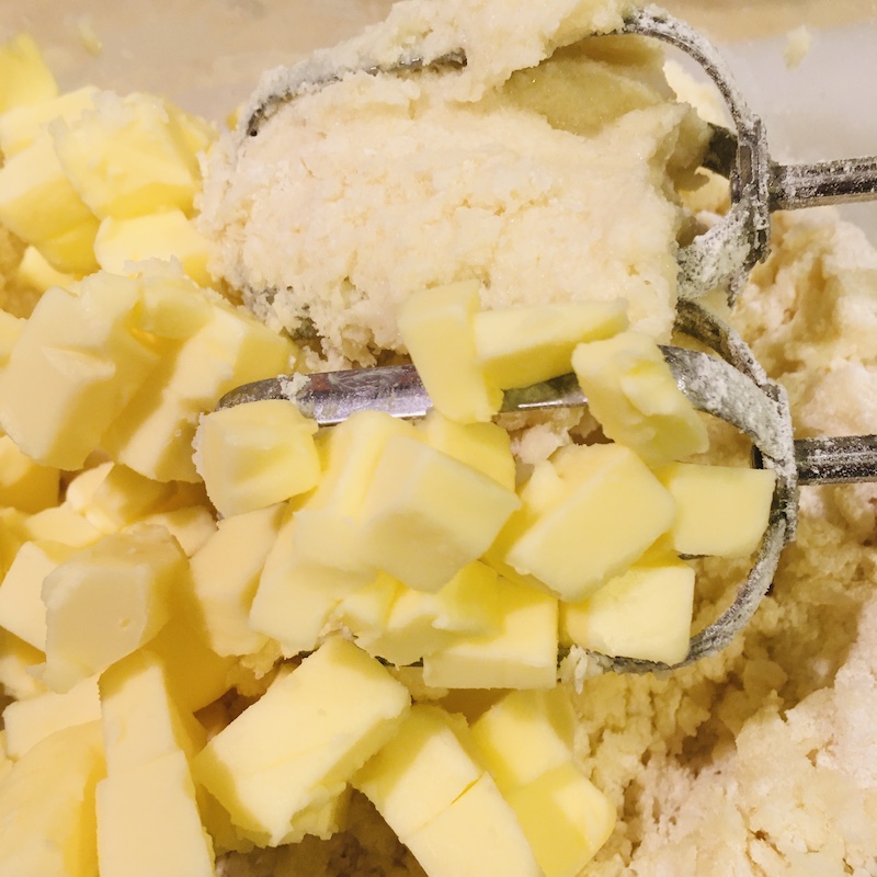 そこに角切りにして室温にもどした柔らかいバターを加え、ハンドミキサーのミディアムスピードで約1分半ほど空気を混ぜ込むようにしながら全体が混ざるように混ぜる。
