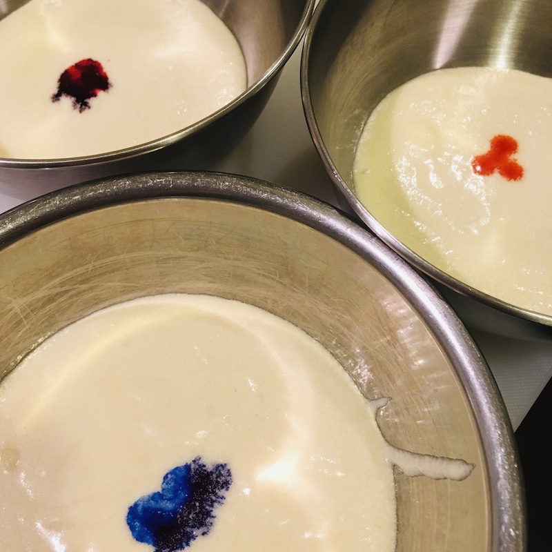 ここは節約して基本の白いケーキ1本分の生地を作り、生地の一部を取り分けて3色に着色することにした。