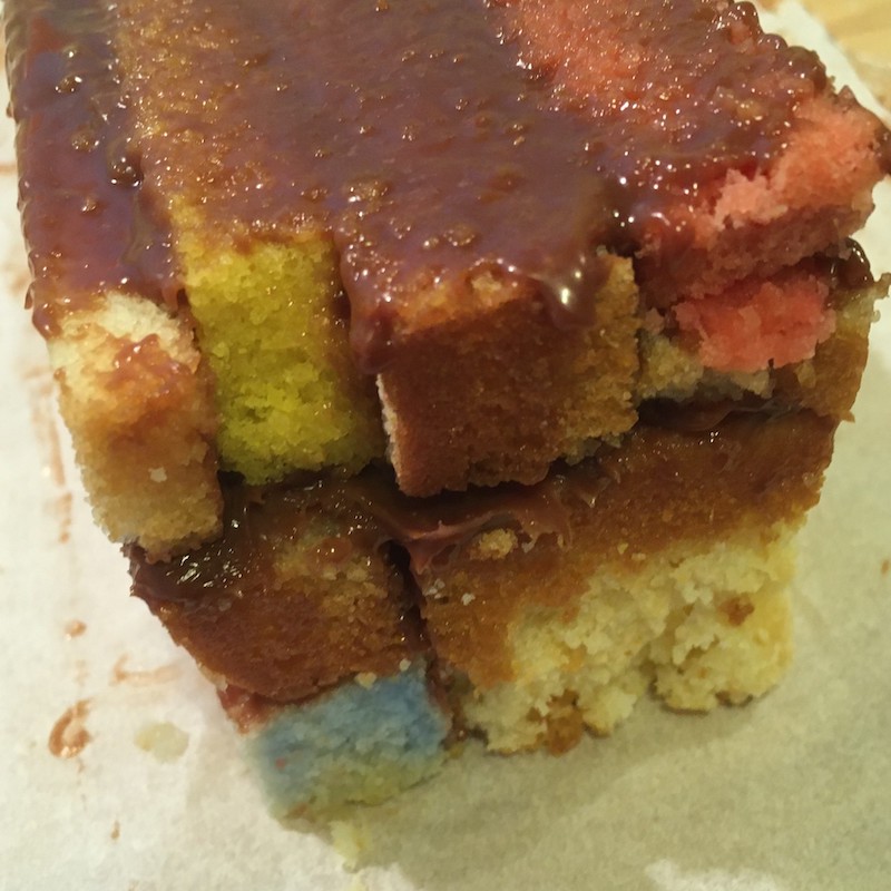 手間と時間はかかりますが、出来上がったケーキをカットした時に現れる赤青黄色の四角形と縦横のグリッドラインを見たら、手間暇かけただけのことはあると大満足。