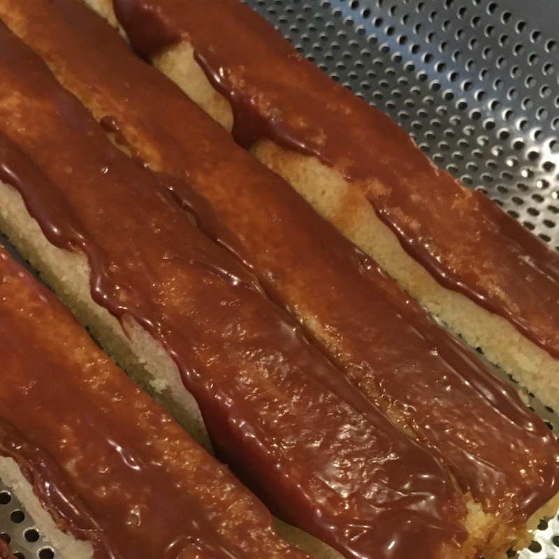 24. 上からたっぷりとチョコレートガナッシュをかけ、少なくとも上面と片側の側面L字型はきれいにガナッシュをつける。