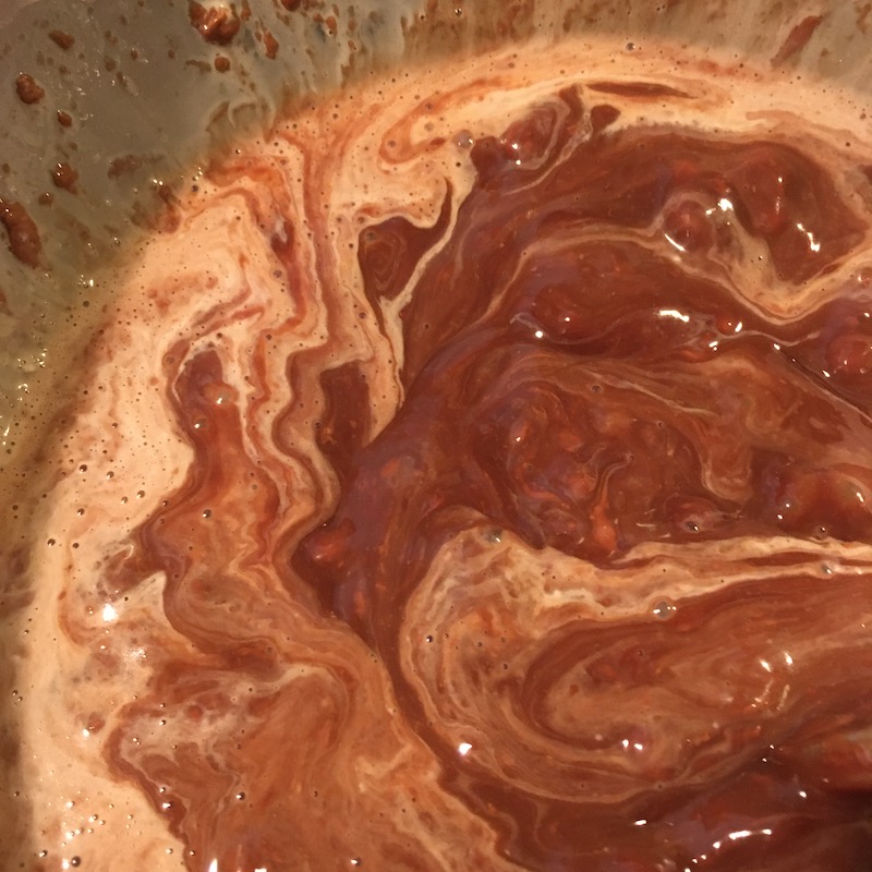 30. チョコレートガナッシュを冷蔵庫から出して、50度の湯煎にかけ、完全に溶かす。