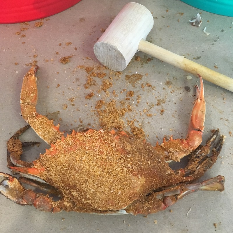 メリーランド訛りで話すウェイトレスがテーブルの上に紙のシートを敷き、その上に木製のトンカチと小さなナイフが入ったプラスチックバケツをドンと置いて行った。