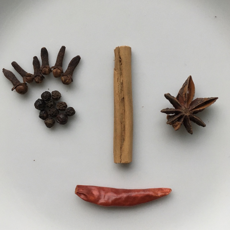 シナモン、クローブ、黒胡椒、赤唐辛子、スターアニスだ。