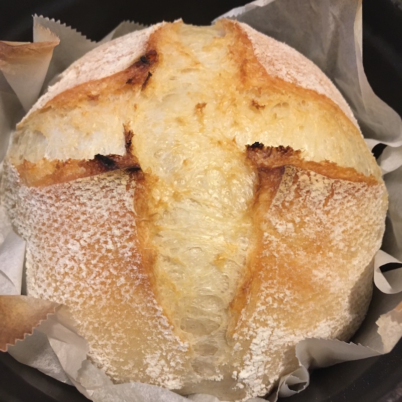 - 二次発酵の40分が経過したら、パンの上になる方に鋭いナイフで切れ目を入れ、熱したストウブの中に入れて蓋をし、オーブンに戻して約20〜30分焼く。(クッキングペーパーで二次発酵させた場合はクッキングペーパーごとストウブの中に入れる。)
