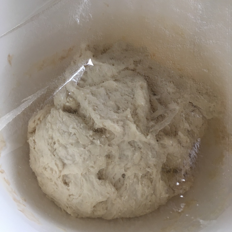 2時間経過して一次発酵が完了したら、容器は密封せずに軽くラップか蓋をかぶせてパン種が呼吸できるようにしておき、そのまま冷蔵庫に入れて一晩寝かせる。