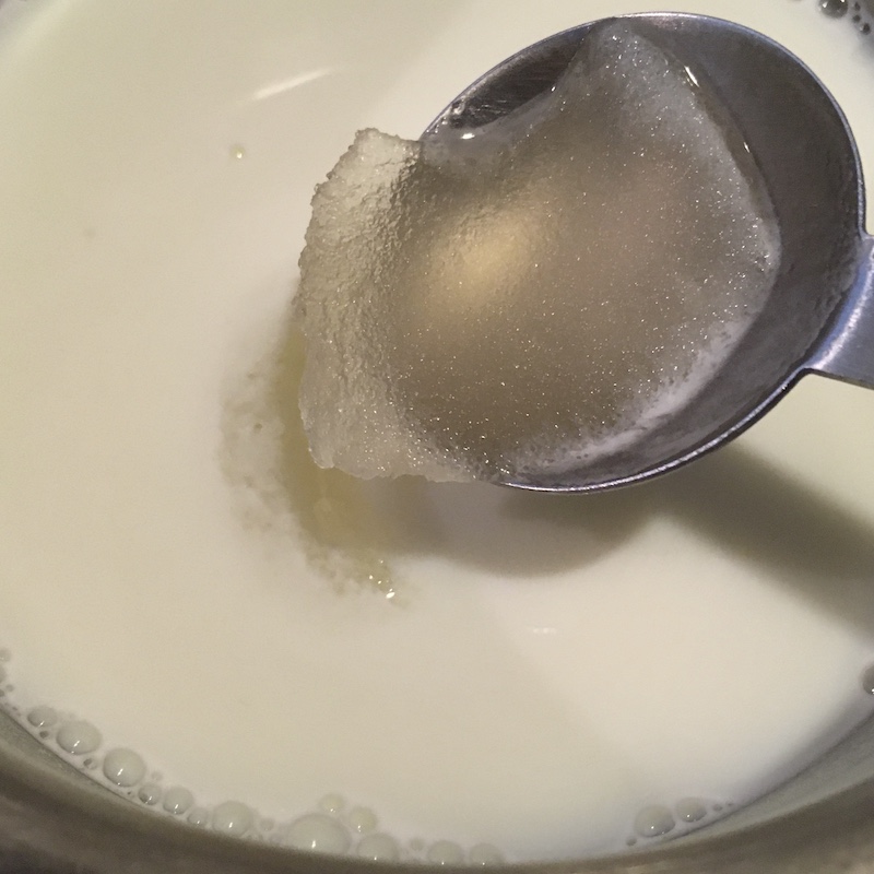 砂糖が溶けて牛乳がお風呂くらいに温まったら火を止めて、ふやかしておいたゼラチンを入れて溶かす。