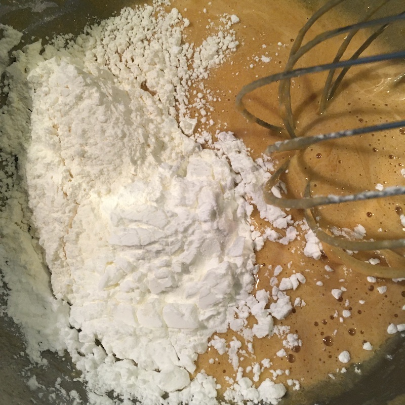 - ボールに卵黄と砂糖を入れてよくすり混ぜ、さらに薄力粉とコーンスターチを入れて混ぜる。