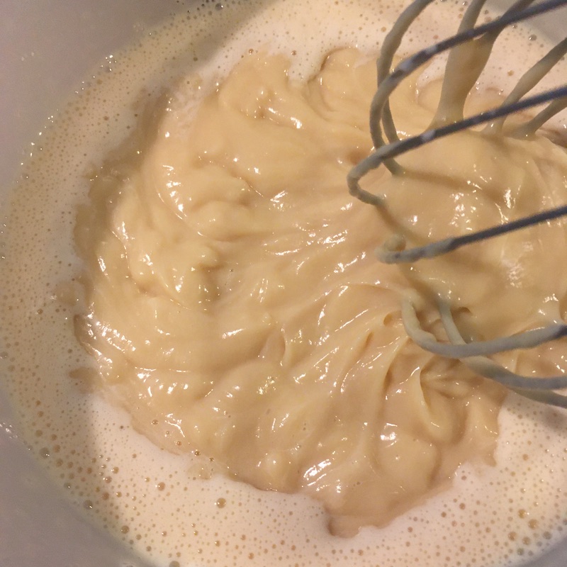 カスタードクリームといえば、卵黄に砂糖と粉類を混ぜ、そこに温めた牛乳を加えてよく混ぜ、網で濾して鍋に戻し、中弱火にかけてダマにならないよう木べらでよく混ぜながら火を通して作るというのが古式ゆかしい作り方だ。