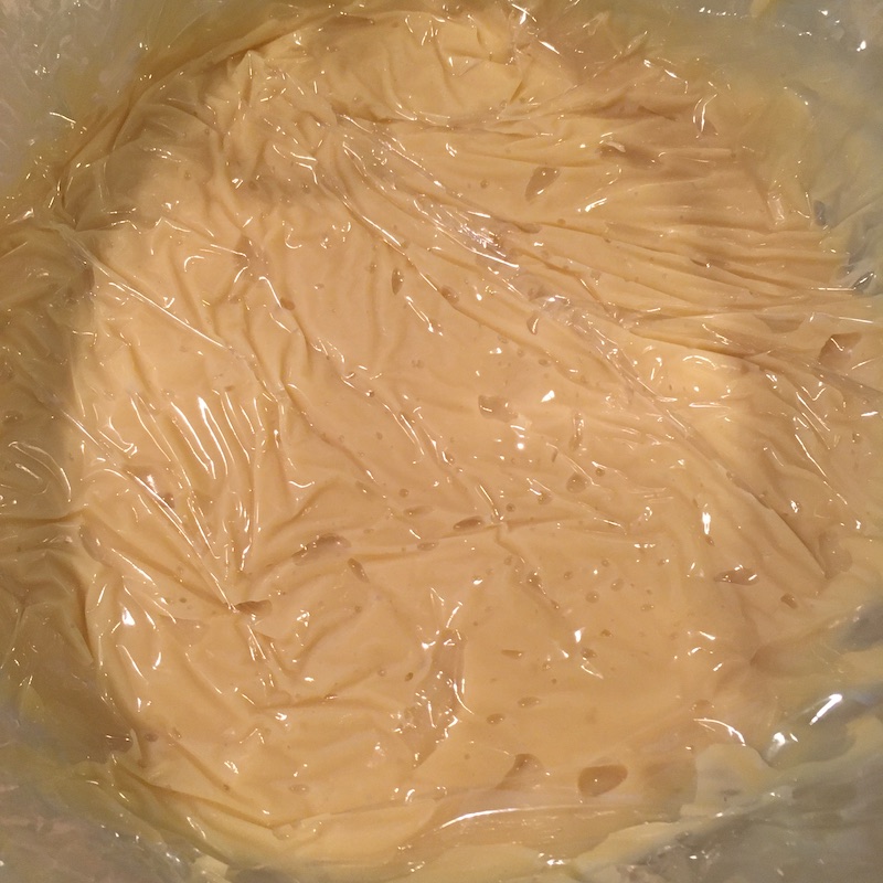 - バターやブランデーを入れる場合はここで入れてよくかき混ぜ、膜ができないようにカスタードクリームの表面にぴったりラップをしてそのままよく冷まして出来上がり。