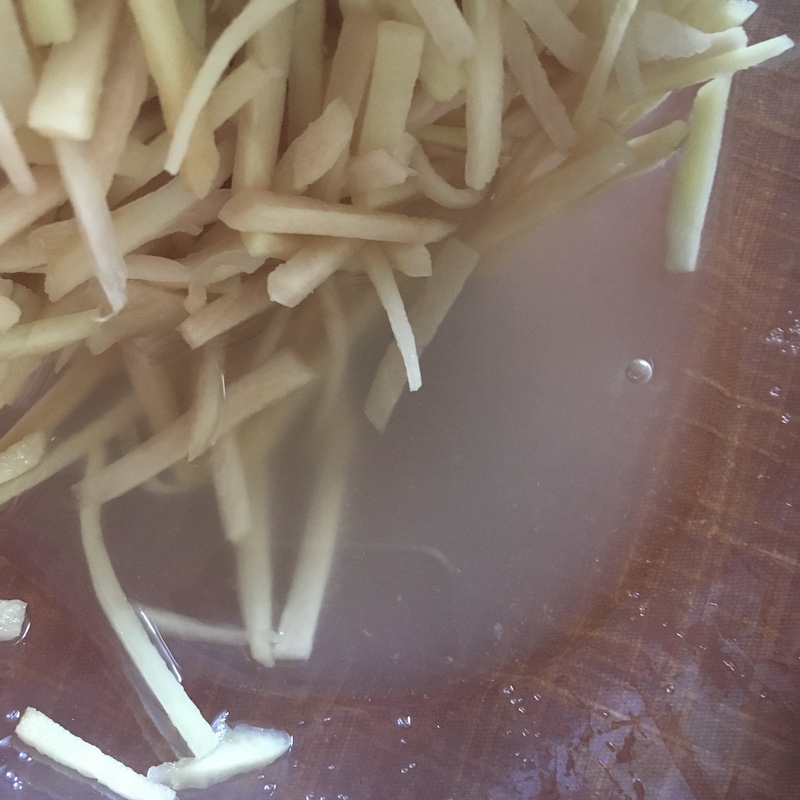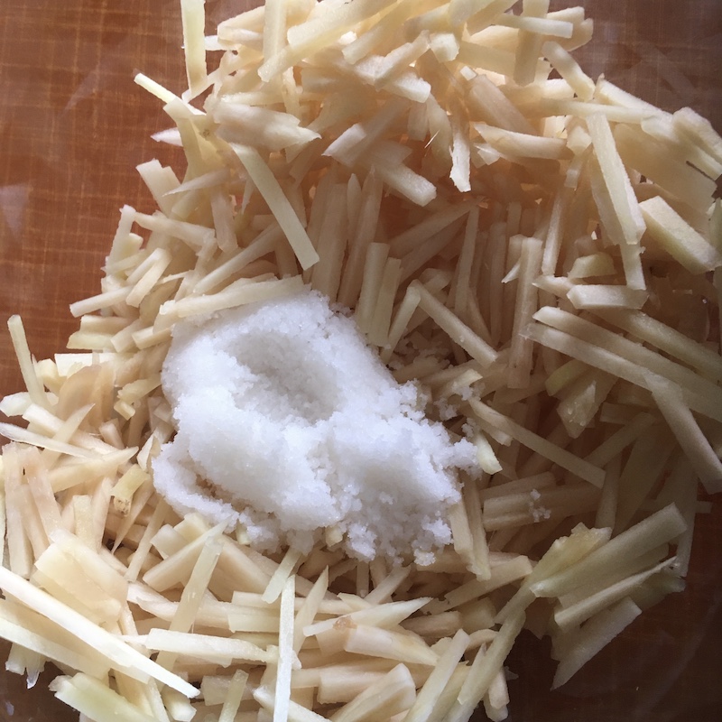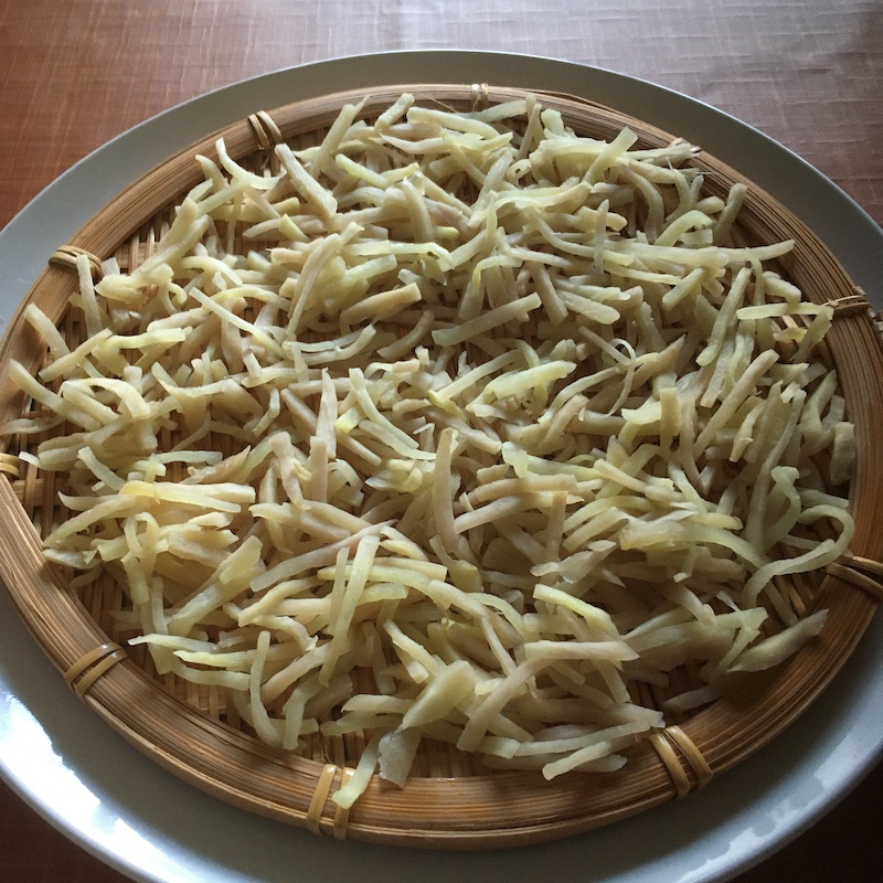 きれいに洗って皮をこそげ落とし、それを千切りにする。