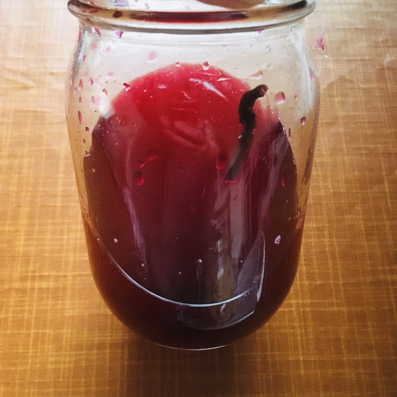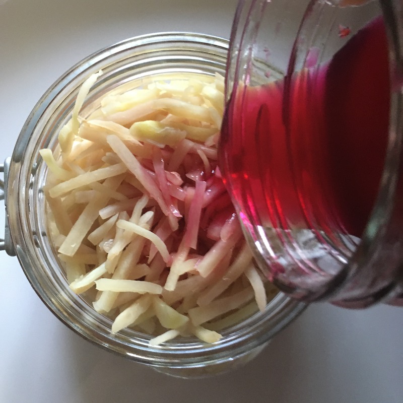 あっという間に紅色に染まるが、このまま1晩冷蔵庫で寝かせると味と色がよく染み込んでこの通り。