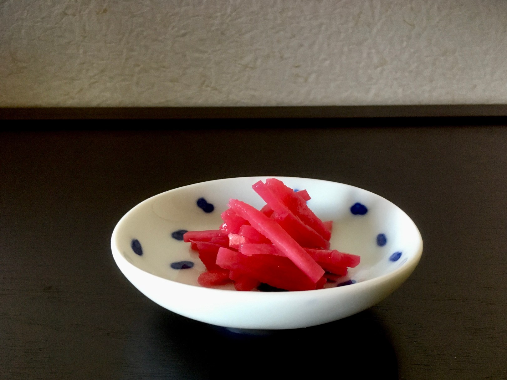 軽く塩漬けした新生姜の千切りに梅酢をかけるだけで出来上がる紅生姜。