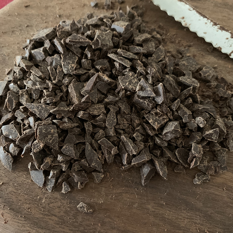 - チョコレートを細かく刻んでボールに入れておく。(ギザギザのナイフを使うとチョコが飛び散らない)