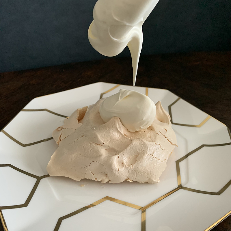 - メレンゲの上に好みの堅さに泡立てておいた無糖の生クリームをたっぷり乗せる。