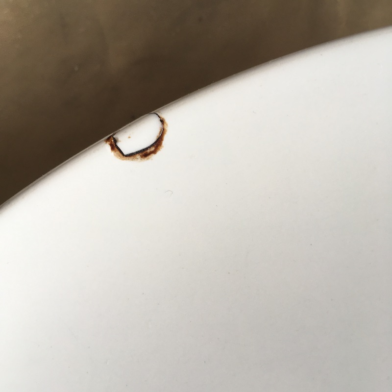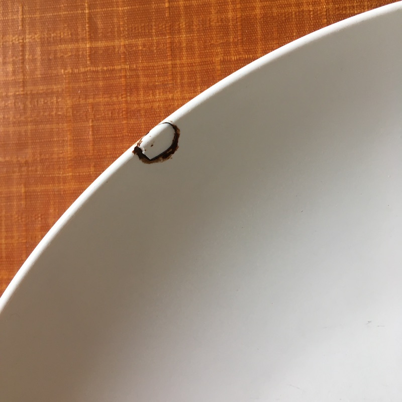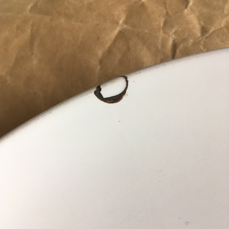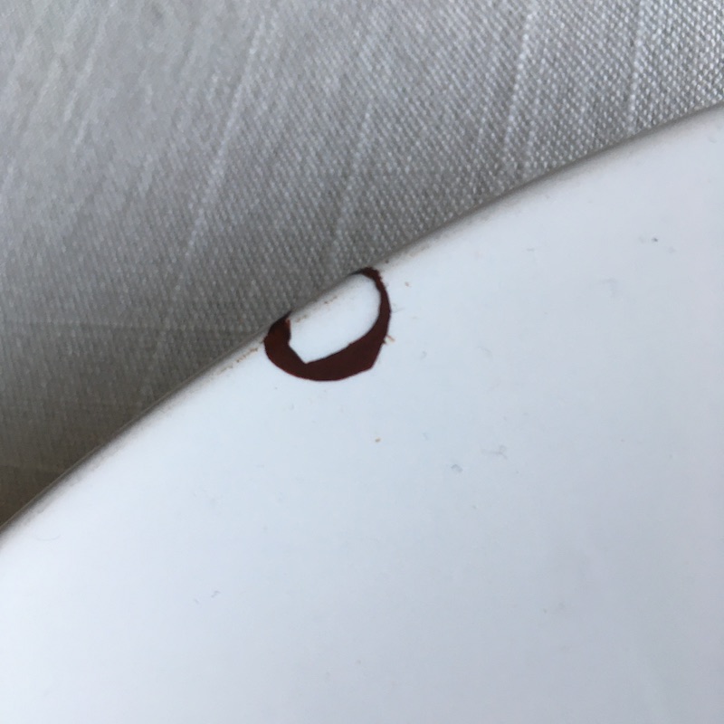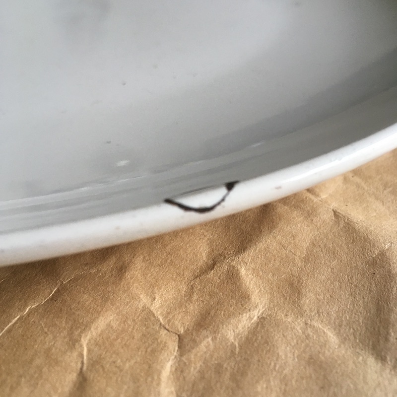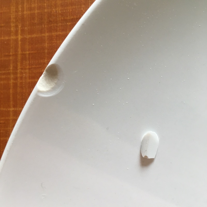 「ん?」と思って皿を見ると、端が小さく欠けていてそのかけらが皿の上にちょこんと置いてある。