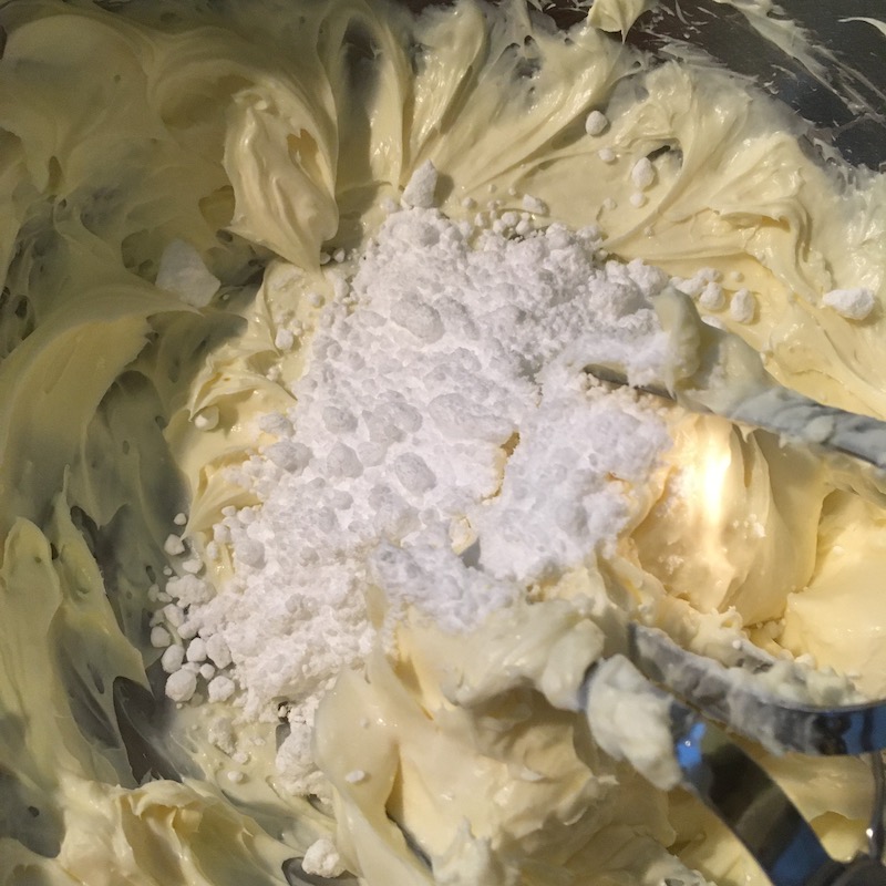 7. フィリングを作る。クリームチーズを室温に戻し、泡立て器でフワッとするまでよく泡だて、粉砂糖を加えてよく混ぜる。