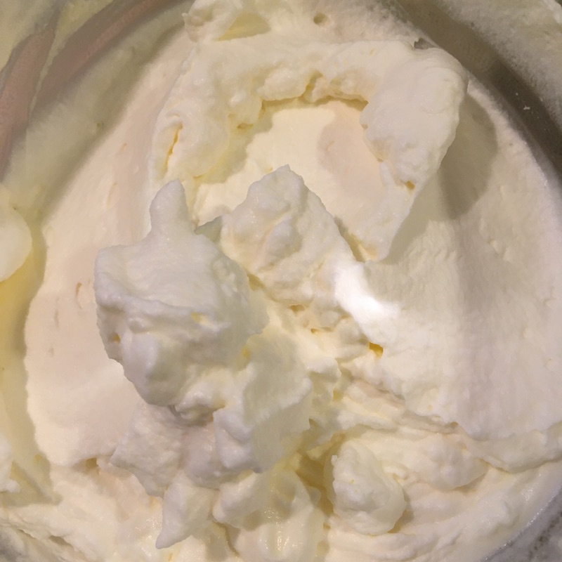 8. 別のボウルに生クリームを入れて角が立つまでよく泡立てる。