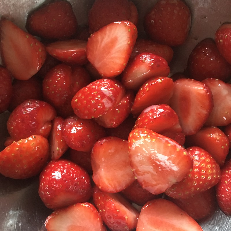 数分置いておくと砂糖が溶けて表面に苺のジュースが出てきてこんな感じで艶々になる。