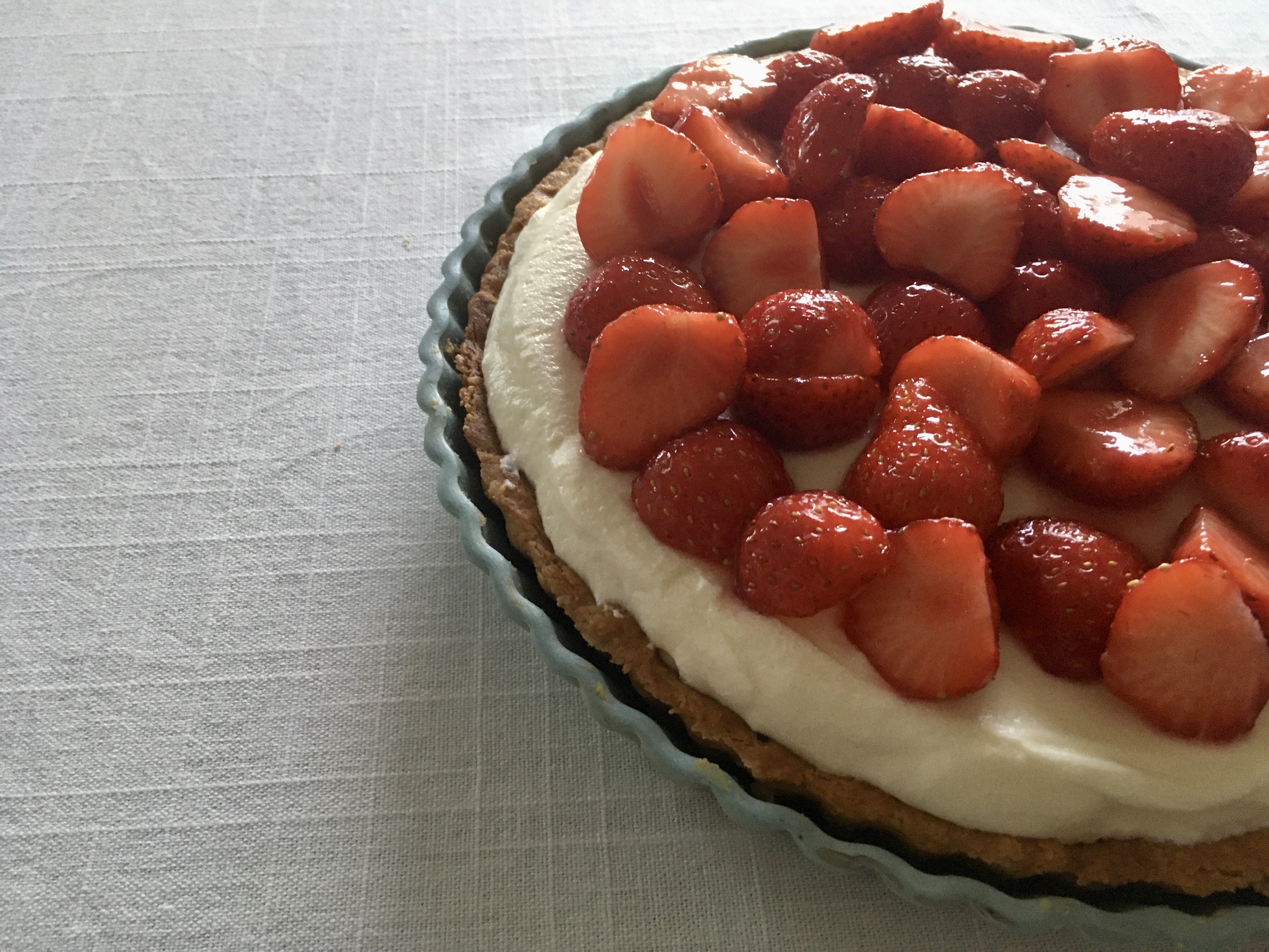 サクサクしたバター風味のタルト台にホイップしたクリームチーズと生クリームのフィリングを詰め、艶々の苺をトッピングした苺のクリームチーズタルト。軽くて爽やかで、今の季節にぴったりのお菓子です。